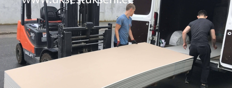Kipsplaatide tõsteteenus korrusele, töömehed kipsplaatide tõstmisel ja kipsplaatide transport. Uksest Ukseni tõsteteenus.